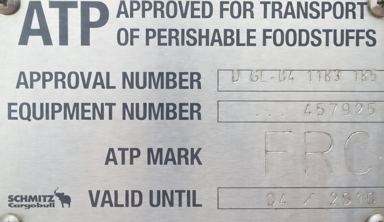 Bu fotoğraf, tipik bir frigorifik araç üzerindeki ATP FRC levhasını gösteriyor: Mavi-beyaz plaka, FRC sınıfı, geçerlilik tarihi ve onay numarasıyla. Araçlarda genellikle arka veya yan kapıda yer alır.