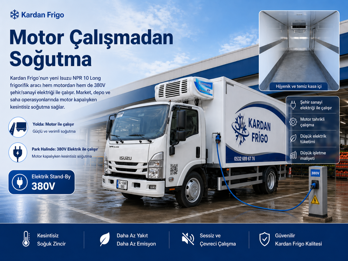 Motor Çalışmadan Soğutma: Kardan Frigo’nun 380V Şehir ve Sanayi Elektriği ile Çalışabilen Yeni Isuzu Frigorifik Aracı Soğuk zincir taşımacılığında ürünlerin doğru sıcaklık aralığında korunması yalnızca yolculuk sırasında değil, aracın bekleme, yükleme, boşaltma ve saha operasyonları sırasında da büyük önem taşır. Özellikle market, depo, üretim tesisi, otel, restoran, gıda ve medikal ürün operasyonlarında frigorifik aracın park […]